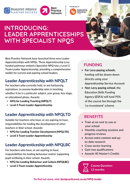 NEW! NPQ Apprenticeships - click on a course below to see how your school can make the most out of their apprenticeship levy for fully funded NPQ apprenticeships.
